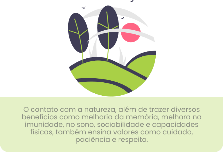 As crianças aprendem sobre valores enquanto vivenciam o contato com a terra, plantas e animais.